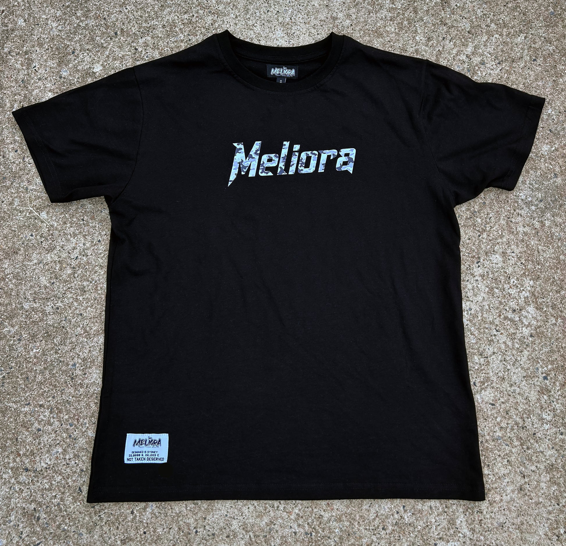 The Meliora Black Camo T-shirt is the perfect wardrobe staple, Boasting a Printed Meliora logo on the front with a Woven patch and custom tag this T-shirt is perfect for every occasion and place.